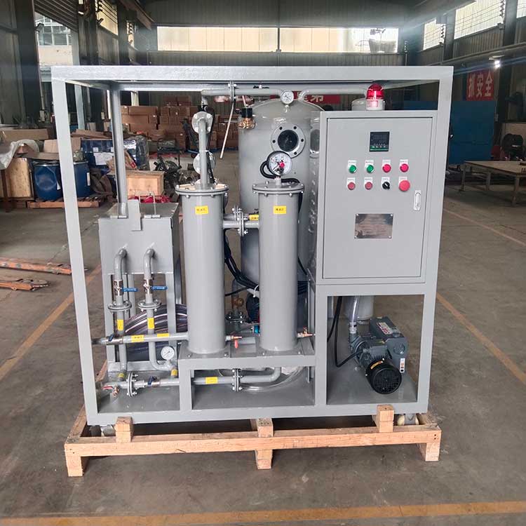 真空濾油機是根據水和油的沸點不同而設計的,它由真空加熱罐、精濾器、初濾器、真空泵、排油泵以及電氣柜組成的。真空泵將真空罐內的空氣抽出形成真空,外界油液在大氣壓力的作用下,經過油入口管道進入初濾器,清除較大的顆粒,然后進入加熱罐內經過加熱到40~75℃的油進入真空罐內,油中的水份急速蒸發成水蒸氣并連續被真空泵吸入油水分離器內,分離器內的水蒸氣經冷卻后還原成水后放出。在真空加熱罐內的油液被排油泵排入精濾器通過濾芯將微粒雜質過濾出來。從而完成真空過濾迅速除去油中雜質、水份、氣體的全過程,使潔凈的油從出口處排出機外。